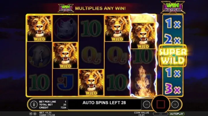 De zesde rol kan behalve op een getal, ook stoppen op ‘Super Wild’. Als dat gebeurt, krijg je een extra spin, waarbij op elke rol gegarandeerd één leeuw komt.