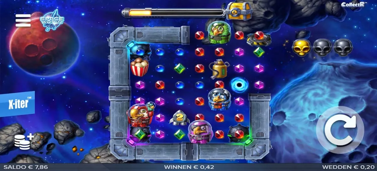 - Lost in Space Coin Game: Verwijder alle symbolen van het veld tijdens de spacecorn feature en je activeert deze bonusronde. Je speelt het op een speelveld van 8x8 met in elke hoek en papegaai. Je krijgt drie levens en er vallen alleen lege vakjes, bruggen en munten op het veld. Vogels verzamelen de munten die op aangrenzende posities staan. Elk nieuw symbool op het veld, reset het aantal levens. Dit lijkt een beetje op Lightning Link op de speelautomaten in Holland Casino.