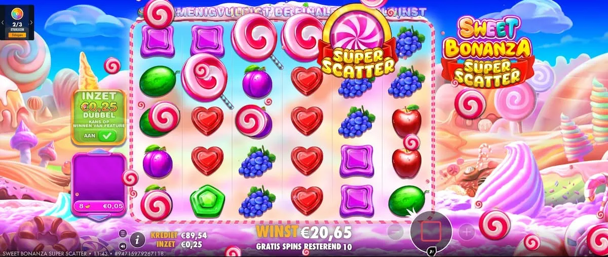 Sweet Bonanza Super Scatter voelt eigenlijk heel vertrouwd aan. Soms vergeet Meneer Casino even dat hij niet ‘gewoon’ Sweet Bonanza aan het spelen is. Tegelijkertijd blijft de spanning van de mogelijke Super Scatters aldoor aanwezig. Zouden ze vallen?